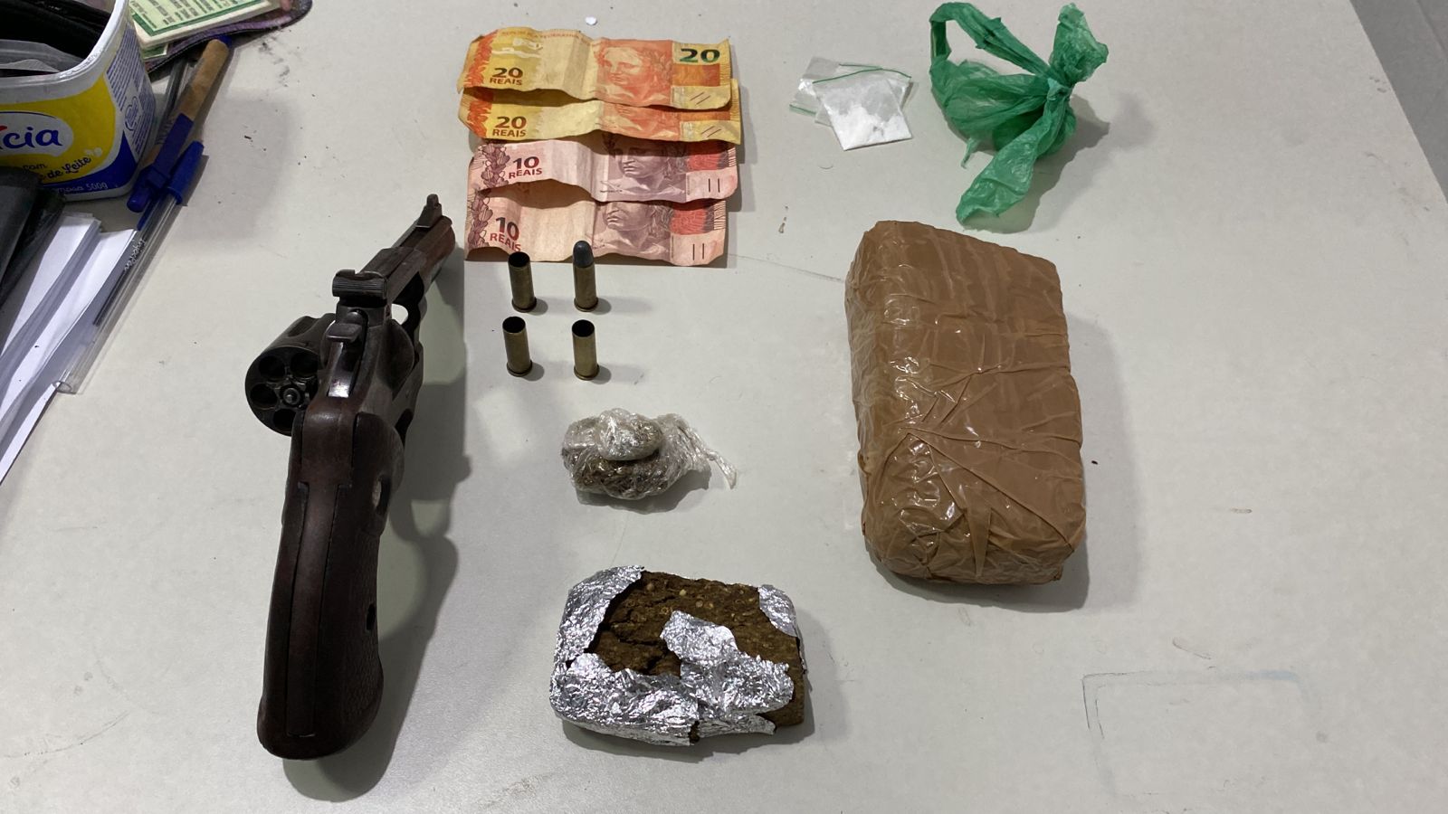 Durante uma busca na residência, foi encontrada uma quantidade de maconha e cocaína, além de um revólver calibre .38 e algumas munições deflagradas. Este revólver foi utilizado pelo suspeito para entrar em confronto com os policiais.