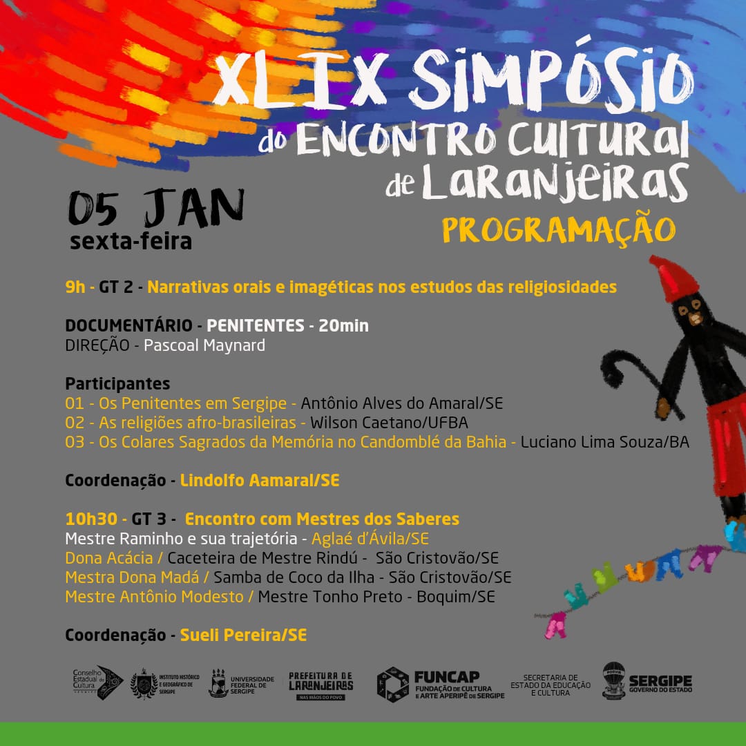 Com o tema ‘Narrativas orais e imagéticas das culturas populares: registros e responsabilidade social’, o evento busca promover discussões enriquecedoras sobre as práticas culturais e experiências vivenciadas. O Simpósio do Encontro Cultural de Laranjeiras é uma realização do Governo de Sergipe, por meio da Fundação de Cultura e Arte Aperipê (Funcap), em parceria com a Universidade Federal de Sergipe (UFS), o Instituto Histórico e Geográfico de Sergipe (IHGSE), o Conselho Estadual de Cultura (CEC) e com o apoio da Prefeitura de Laranjeiras.