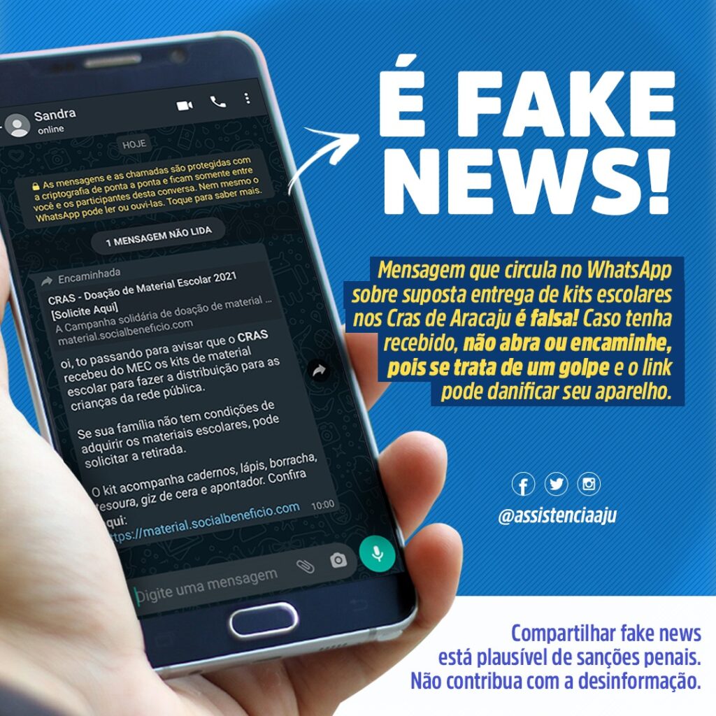 A Secretaria Municipal da Assistência Social de Aracaju desmente a informação que está circulando em grupos de WhatsApp sobre uma suposta entrega de kits escolares nos 16 Centros de Referência da Assistência Social (Cras) de Aracaju para famílias de baixa renda.
