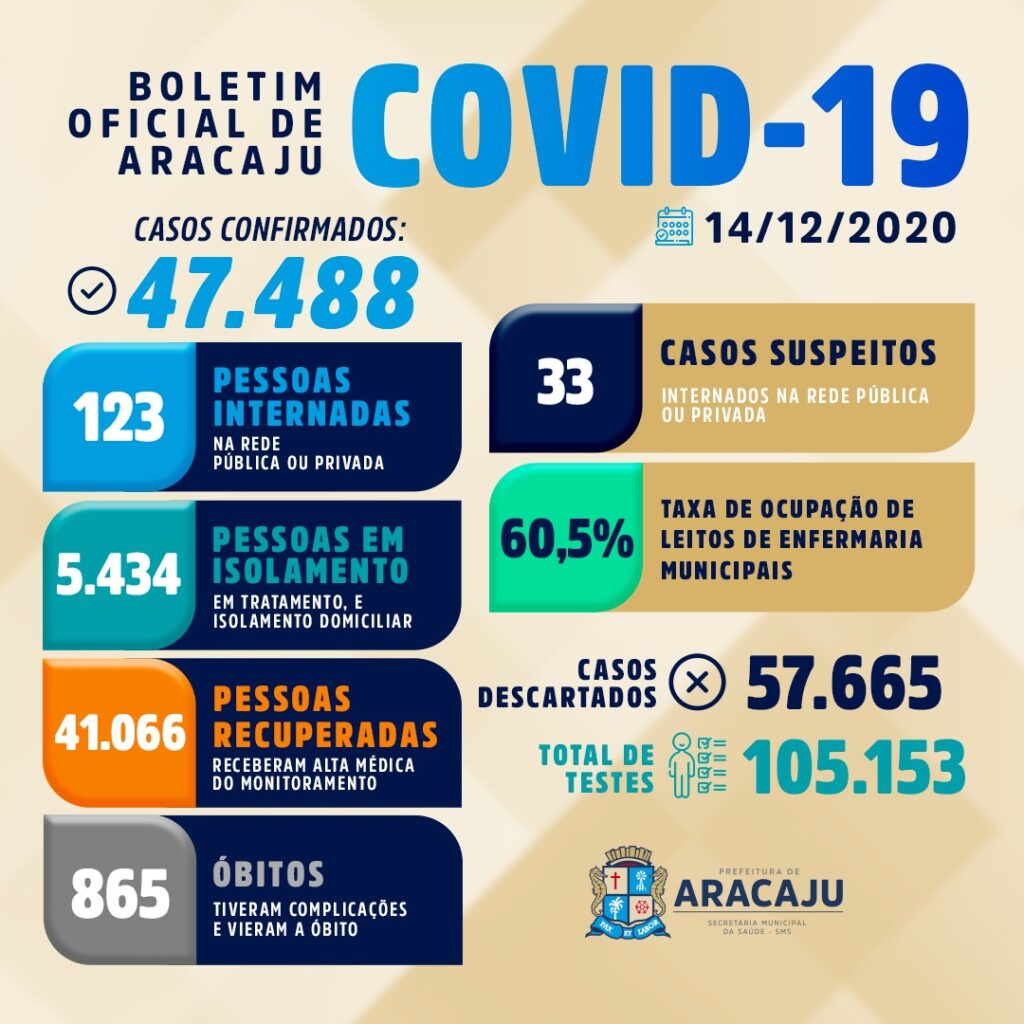 Com isso, sobe para 47.488 o número de pessoas diagnosticadas com covid-19 em Aracaju. Dessas, 123 estão internadas em hospitais; 5.434 estão em isolamento domiciliar; 41.066, que estavam infectadas já estão recuperadas; e 865 vieram a óbito.