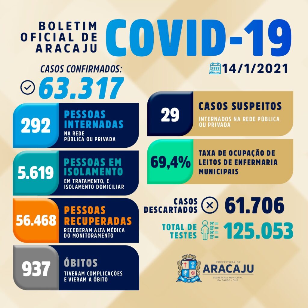 Com isso, sobe para 63.317 o número de pessoas diagnosticadas com covid-19 em Aracaju. Dessas, 292 estão internadas em hospitais; 5.619 estão em isolamento domiciliar; 56.468, que estavam infectadas já estão recuperadas; e 937 vieram a óbito.