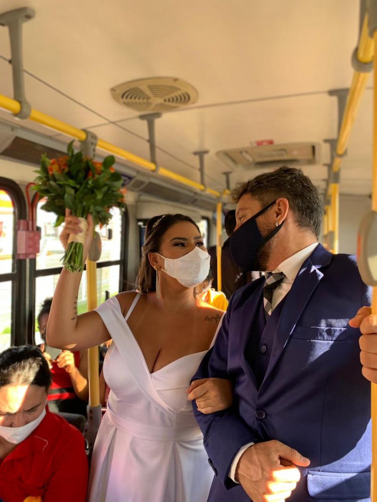 Os noivos são prestadores de serviços e simularam esse casamento dentro do ônibus como uma forma de destacar a aglomeração no transporte coletivo.