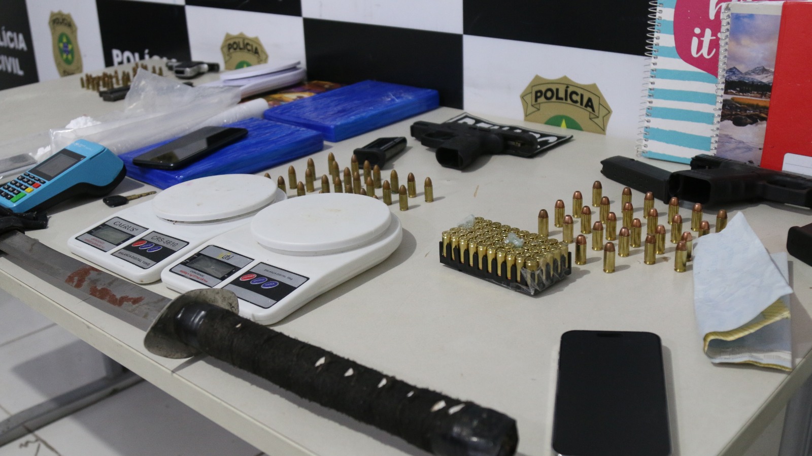 A ação apreendeu três pistolas, uma motocicleta, dois quilos de cocaína e insumos para mistura com a droga. Duas armas foram apreendidas em Lagarto, uma em São Cristóvão e os demais itens foram encontrados no bairro aracajuano.