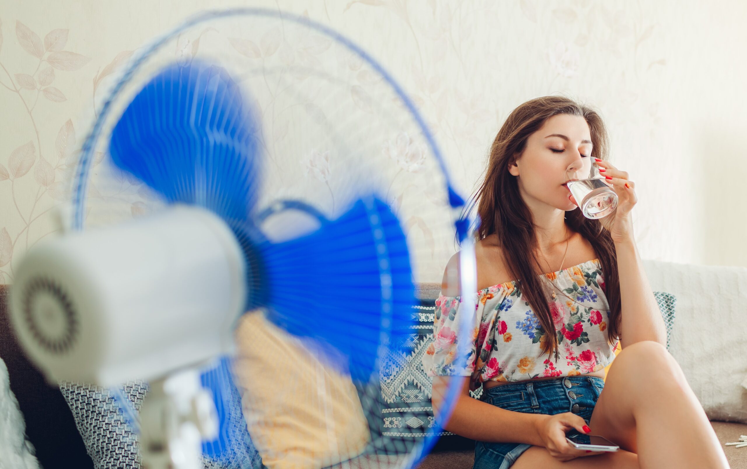 Young woman cooling down by electric ventilator at home while drinking water and hanging in phone. Summer heat.