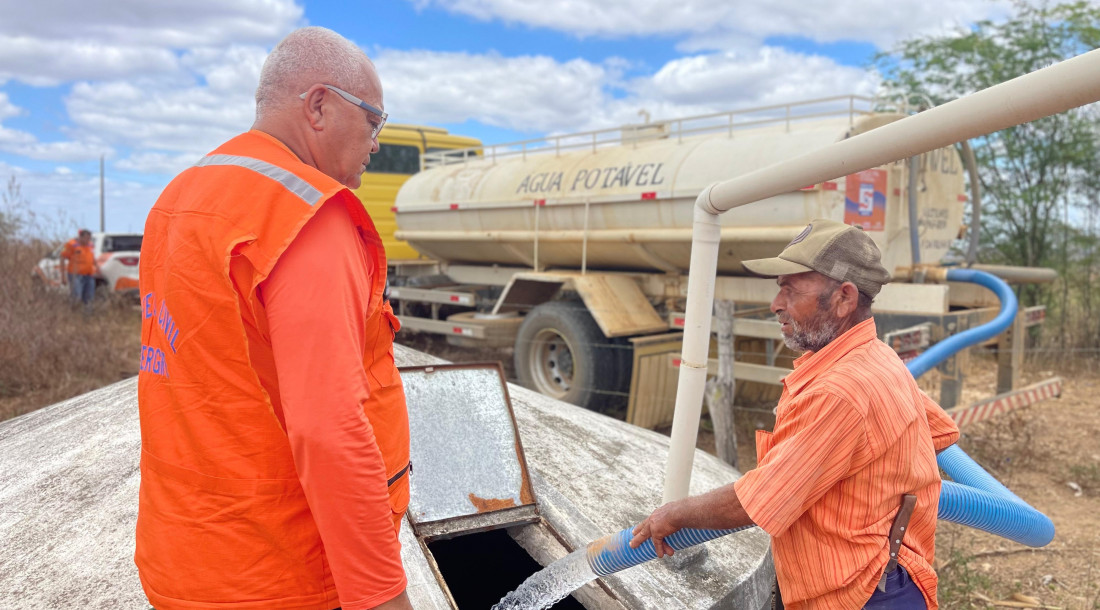 Um dos atendimentos da equipe da Defesa Civil ocorreu na residência de seu José Roberto dos Santos, na zona rural de Glória. “Quando vi chegar essa carrada para encher a cisterna da minha casa, tive uma alegria tão grande!”, enfatizou o agricultor ao abastecer o reservatório.