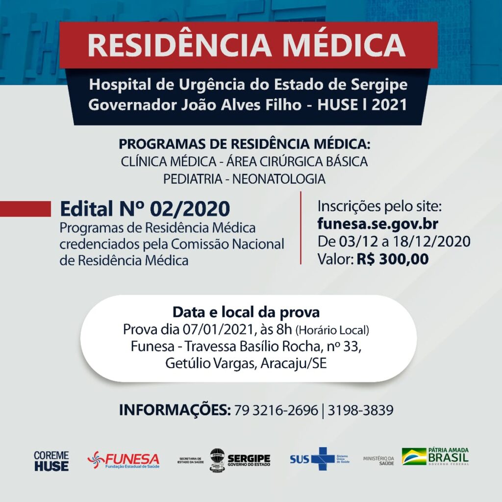 Encontram-se abertas desde o último dia 3 de dezembro e seguem até o próximo dia 18, as inscrições para o Processo Seletivo de Residência Médica 2021, para vagas no Hospital de Urgências de Sergipe Governador João Alves Filho. A Residência Médica é a única forma de qualificação e especialização dos médicos no Brasil. Em Sergipe, a Secretaria de Estado da Saúde (SES) realiza as inscrições por meio eletrônico, através do site da Fundação Estadual de Saúde (Funesa): www.funesa.se.gov.br, onde também está o Edital 02/2020, com todas as informações.