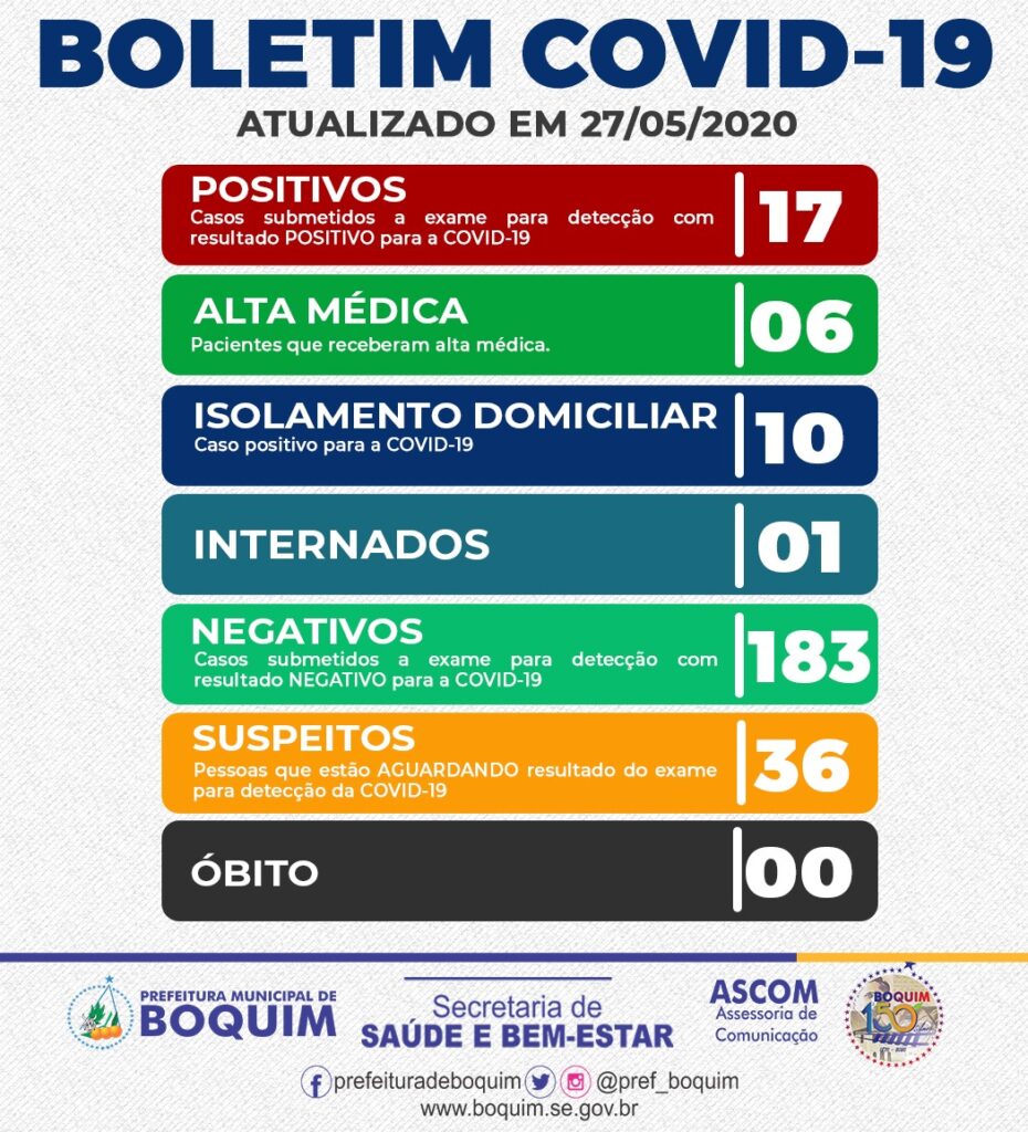 A Prefeitura Municipal, através da Secretaria de Saúde e Bem-Estar, por meio da equipe da Vigilância Epidemiológica, recebeu nesta quarta-feira, dia 27 de maio, a informação que a paciente do sexo feminino de 27 anos de idade, que estava em isolamento domiciliar no Município de Boquim, retornou para sua cidade de origem, seguindo todas as recomendações médicas.