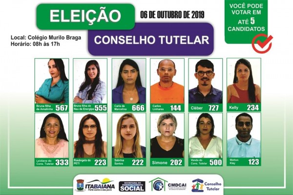 No próximo domingo, dia 6 de outubro, acontecerá o Processo de escolha dos membros do Conselho Tutelar para o quadriênio 2020/2024. Em Itabaiana, serão eleitos cinco conselheiros que atuarão no município a partir do dia 10 de janeiro de 2020.