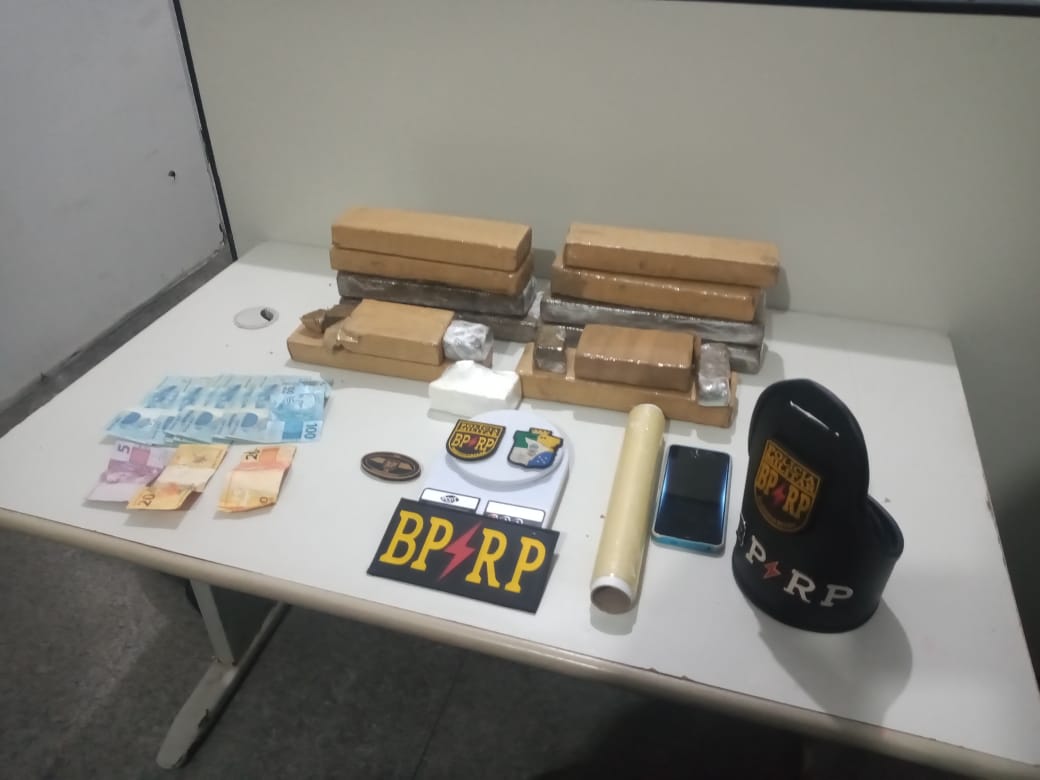 No local, também foram apreendidos uma porção de cocaína, balança de precisão, papel filme e uma certa quantia em dinheiro.