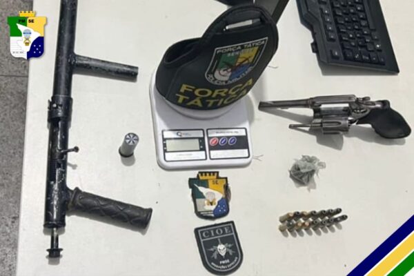Um suspeito foi alcançado e abordado, momento em que a equipe apreendeu um revólver calibre .38. Ainda na ação, uma espingarda calibre .12, uma pequena embalagem de maconha, uma balança de precisão e 16 munições foram apreendidas.