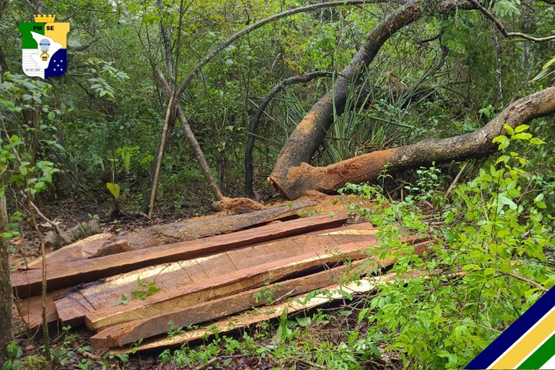 Durante o início das buscas, os policiais já conseguiam ouvir o barulho da motosserra. Seguindo o ruído do equipamento de corte, os militares avançaram cerca de dois quilômetros de mata fechada, até flagrarem os dois suspeitos efetuando o corte de uma árvore nativa, da espécie Ipê.