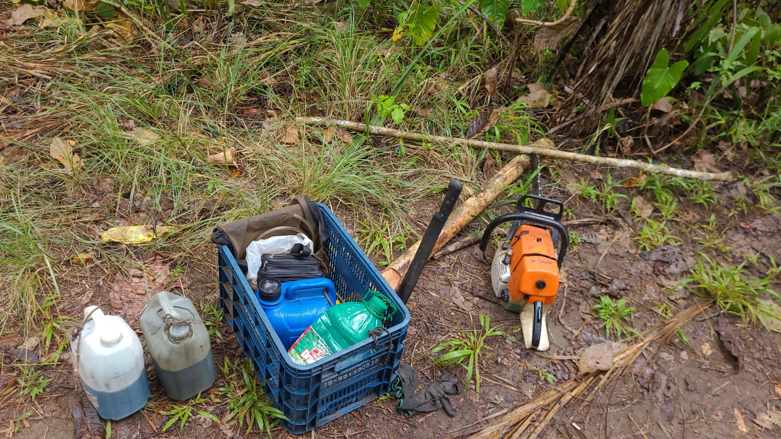 No local do crime também foi encontrada madeira cortada da árvore Ingá-Poca, além dos instrumentos utilizados no desmatamento: uma motosserra, um facão e diversas ferramentas.