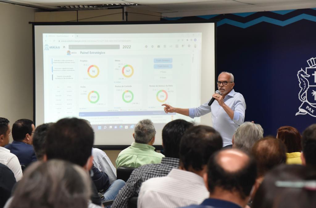 O prefeito Edvaldo Nogueira reuniu os secretários e diretores de todos os órgãos municipais, na manhã desta segunda-feira, 18, para fazer um balanço dos primeiros 18 meses da atual gestão e apresentar o andamento do Planejamento Estratégico para os próximos dois anos e meio. No encontro, o prefeito reiterou a importância de “todos se manterem focados no alcance das metas e na entrega dos resultados à população”.