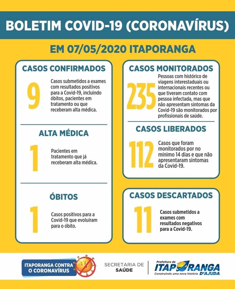 Dos nove casos positivados um foi registrado óbito em 22 de abril, outro paciente recebeu alta médica na última segunda-feira, 04 de maio, outros seis casos estão notificados com orientações de isolamento domiciliar e um caso está em isolamento hospitalar. Outros 11 casos foram negativados e descartados.