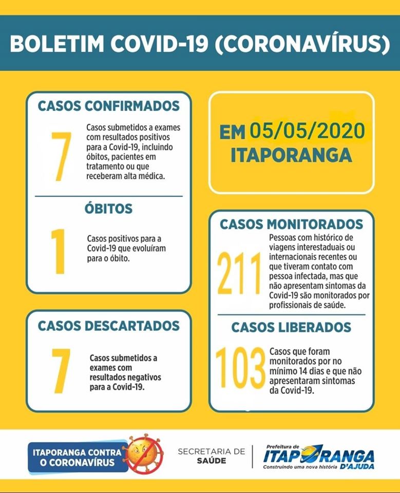 Dos sete casos positivados um foi registrado óbito em 22 de abril, outro paciente recebeu alta médica na última segunda-feira, 04 de maio, e os outros cinco casos estão notificados com orientações de isolamento domiciliar. Outros 7 casos foram negativados e descartados.