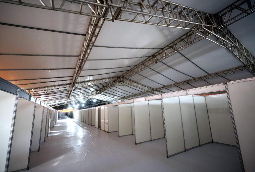 Até lá, a Defesa Civil Municipal, coordenada pelo major Silvio Prado, segue realizando vistorias, como as que o órgão realiza desde o início da obra e que resultaram, inclusive, em alterações que visaram garantir mais segurança às estruturas. “A gente vem fazendo, quase que diariamente, vistorias no hospital de campanha, que já está bastante adiantando. Algumas pendências foram solicitadas, como a instalação de mais de 300 parafusos nas estruturas metálicas de sustentação da cobertura”, afirma o coordenador.