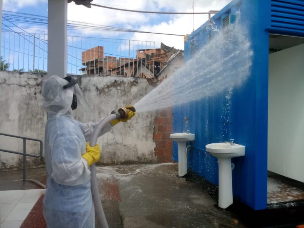 Executada desde 27 de março, nos espaços públicos e locais de aglomeração ou movimentação constante de pessoas, a desinfecção contempla locais como terminais de integração do transporte público, pontos de ônibus e de táxi, mercados, casas de apoio a idosos, dentre outros locais. Recentemente, o serviço passou a ser realizado também nos espaços dos alojamentos provisórios e nas unidades da Secretaria Municipal da Assistência Social.