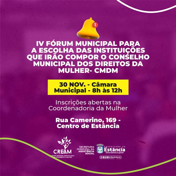 A Prefeitura de Estância, através da Coordenadoria Municipal de Políticas para as Mulheres, em conformidade com a Lei Municipal 1.758 de 02 de setembro de 2015, convida as entidades não governamentais a se inscreverem para o IV Fórum Municipal de seleção das organizações que farão parte do Conselho Municipal dos Direitos da Mulher (CMDM) no biênio de 2024-2025.