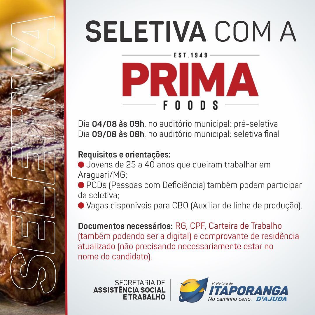 A Prefeitura Municipal de Itaporanga d’Ajuda informa sobre o processo seletivo para vagas na Prima Foods. Quem tiver interesse em participar da seleção deve ficar ligado às seguintes informações e comparecer nas seguintes datas e horários levando a lista de documentos solicitados.