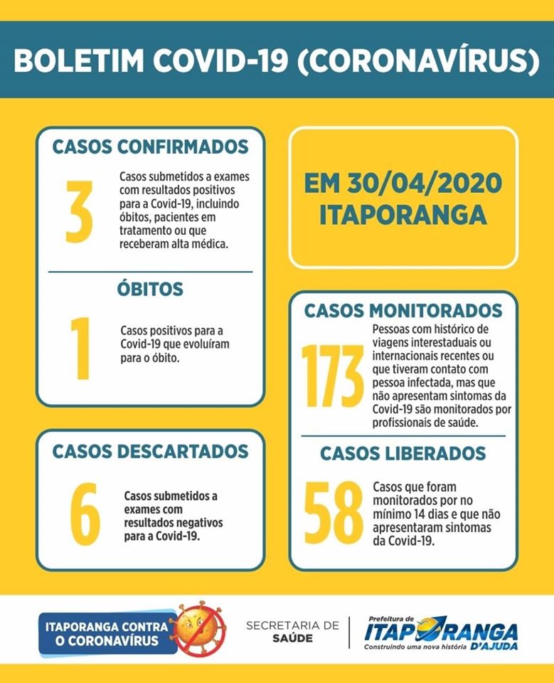 No boletim dessa quinta-feira, 30 de abril, a Secretaria Municipal de Saúde informa que os casos confirmados estão sendo monitorados por profissionais de saúde e foram orientados a cumprir isolamento domiciliar, bem como as pessoas que convivem com eles no mesmo ambiente.