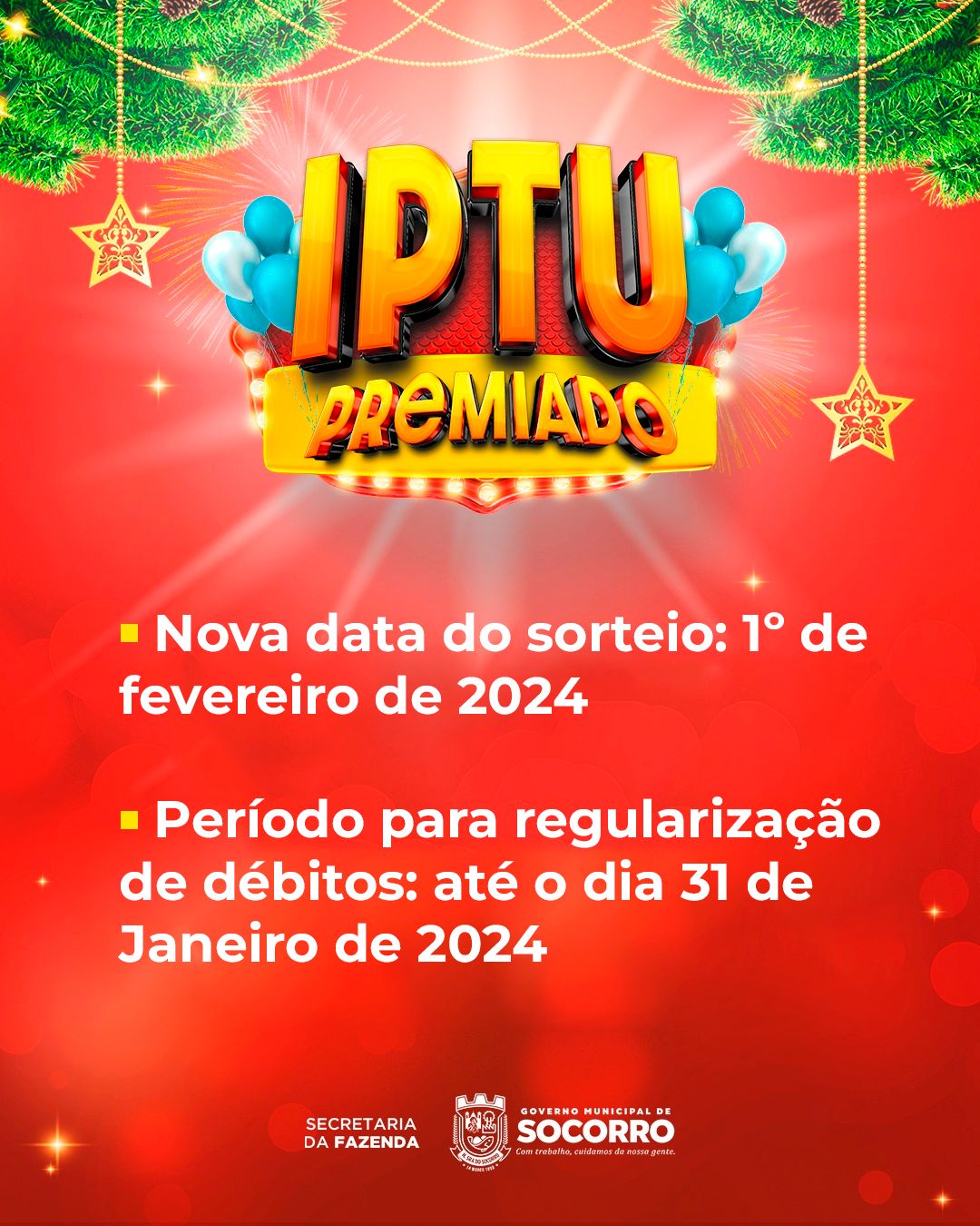 A Prefeitura de Socorro, por meio da Secretaria Municipal da Fazenda (Semfaz), informa que o prazo para quitar os débitos do IPTU dos últimos cinco anos e, dessa forma, garantir a participação no IPTU Premiado foi prorrogado até o dia 31 de janeiro de 2024. Com isso, o sorteio do IPTU Premiado, agendado para ocorrer nesta quarta-feira, 20, foi adiado.