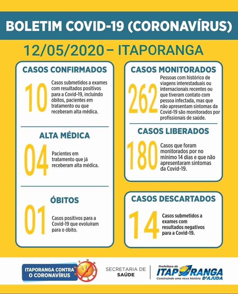 No boletim dessa terça-feira, 12, a Secretaria Municipal de Saúde informa mais 01 (um) caso confirmado de Coronavírus em Itaporanga, com isso o município chega 10 (dez) Casos Confirmados. Trata-se de um homem de 24 anos, que reside em povoado. O paciente está sendo monitorado por profissionais de Saúde e foi orientado a cumprir isolamento domiciliar, bem como as pessoas que convivem com eles no mesmo ambiente. A Secretaria informa ainda que mais 02 (dois) pacientes receberam alta médica, uma mulher de 34 anos e um homem de 33 anos. Ambos já estão aptos a retornarem as suas atividades normais. O paciente que estava em internamento hospitalar recebeu alta e está em isolamento docimiliar, sendo acompanhado por profissionais da SMS.