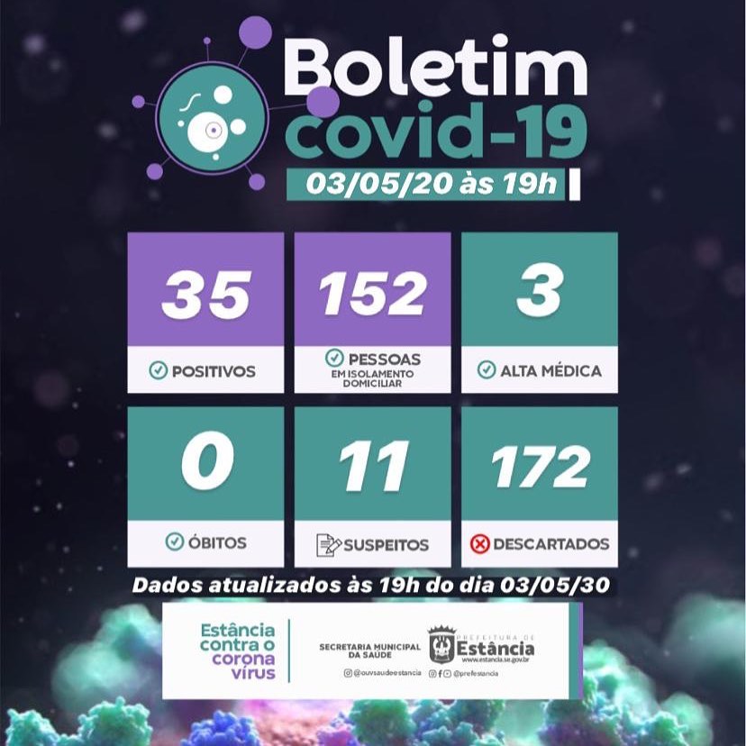 A Secretaria Municipal da Saúde de Estância confirmou no início da noite deste domingo, 3, novos casos de Covid-19. Com isso, a cidade passa a contar com 35 casos de Coronavírus. Até o momento foram realizados 218 testes clínicos. Com 35 casos positivos, 11 pacientes estão aguardando o resultado e 172 foram negativados.