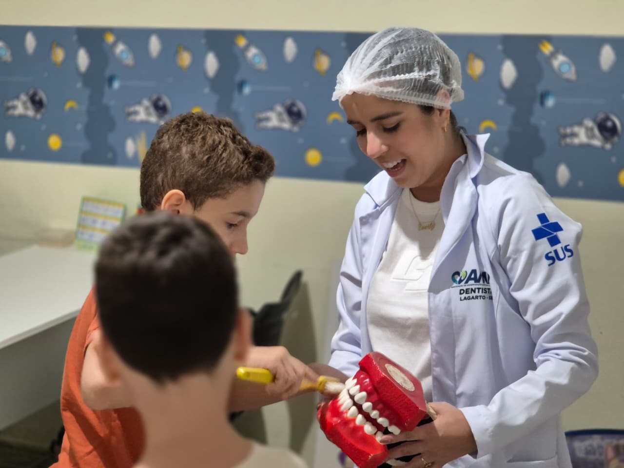 A Secretaria Municipal de Saúde (SMS) de Lagarto realizou, nesta quarta-feira, 15, uma ação voltada à saúde bucal de crianças atípicas atendidas pelo Ambulatório Integrar. A iniciativa, conduzida por profissionais da odontologia, teve como foco orientar pais e cuidadores sobre a escovação correta e tornar esse cuidado mais acessível e lúdico para as crianças, promovendo também acolhimento às famílias.