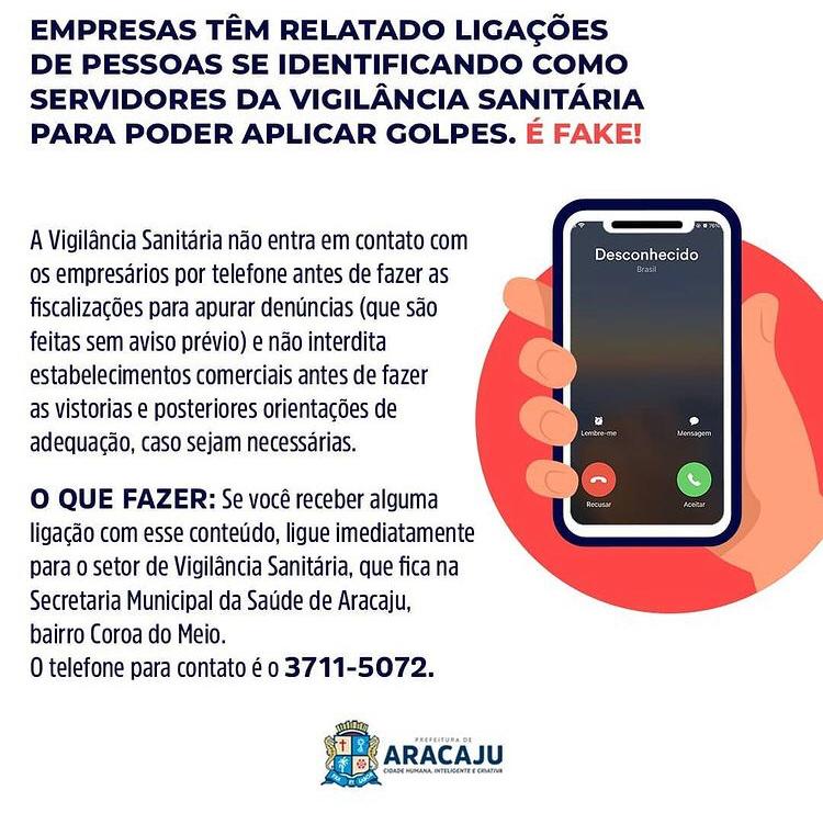 A Secretaria Municipal da Saúde (SMS) desmente a informação que está circulando sobre o golpe de um suposto funcionário da Vigilância Sanitária de Aracaju que estaria entrando em contato com empresários, por telefone, afirmando ser fiscal do órgão com a finalidade de aplicar golpes a partir de ameaças. Empresas têm comunicado à Secretaria que estão recebendo ligações de pessoas que dizem ser funcionárias da Vigilância Sanitária do município, as quais estariam repassando informações falsas.
