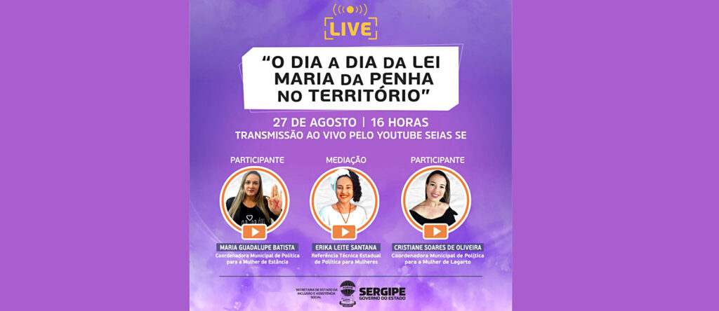 Para debater sobre o atendimento e acompanhamento das mulheres vítimas de violência em Sergipe, acontecerá nesta quinta-feira (27), às 16h, a Live “O dia a dia da Lei Maria da Penha no território”, com transmissão ao vivo no YouTube SEIAS SE. Realizado pela Secretaria de Estado da Inclusão e Assistência Social (SEIAS), o encontro virtual contará com a participação de referências em políticas públicas para as mulheres, que dialogarão sobre casos e experiências práticas, a aplicabilidade da Lei nas cidades e a articulação entre a Rede de Atendimento à Mulher, em Sergipe.